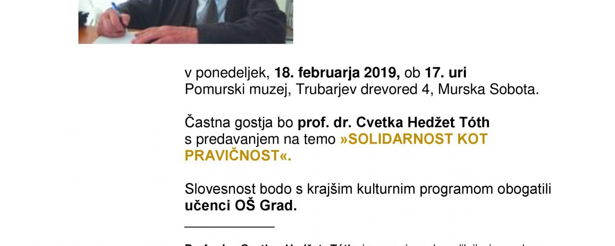 Ćastna gostja bo prof. dr. Cvetka Hedžet Tóth s predavanjem na temo »SOLIDARNOST KOT PRAVIČNOST«.