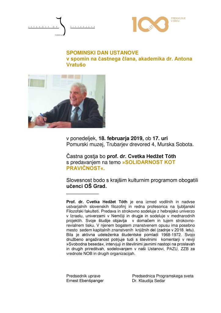 Vabljeni na Spominski dan ustanove v spomin na častnega člana, akademika dr. Antona Vratušo, ki bo v ponedeljek, 18. februarja 2019, ob 17. uri v Pomurskem muzeju, Trubarjev drevored 4, Murska Sobota.