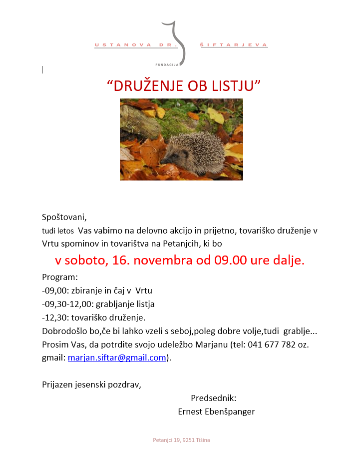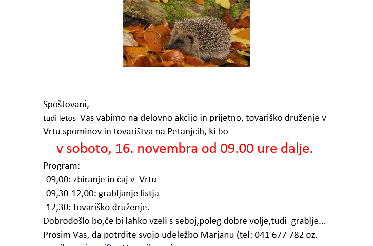 Spoštovani, tudi letos Vas vabimo na delovno akcijo in prijetno, tovariško druženje v Vrtu spominov in tovarištva na Petanjcih, ki bo v soboto, 16. novembra od 09.00 ure dalje.