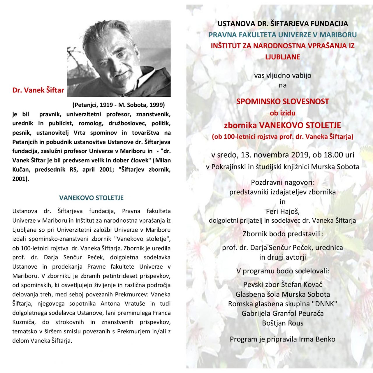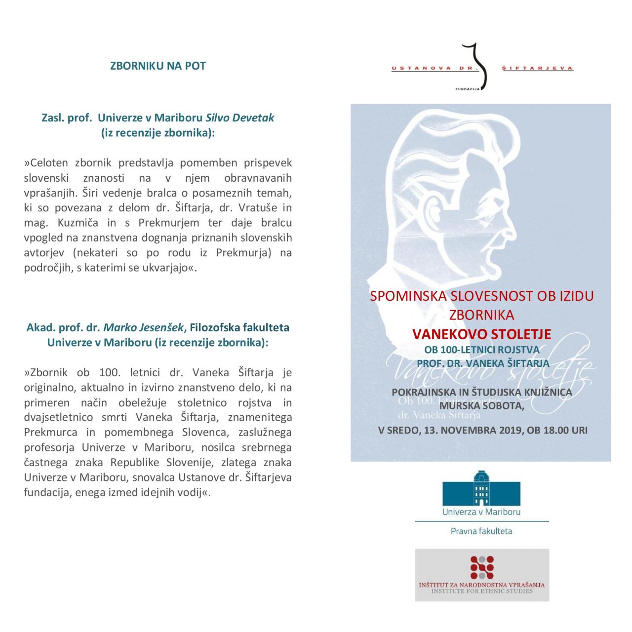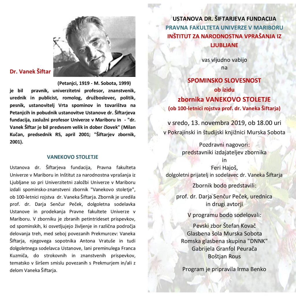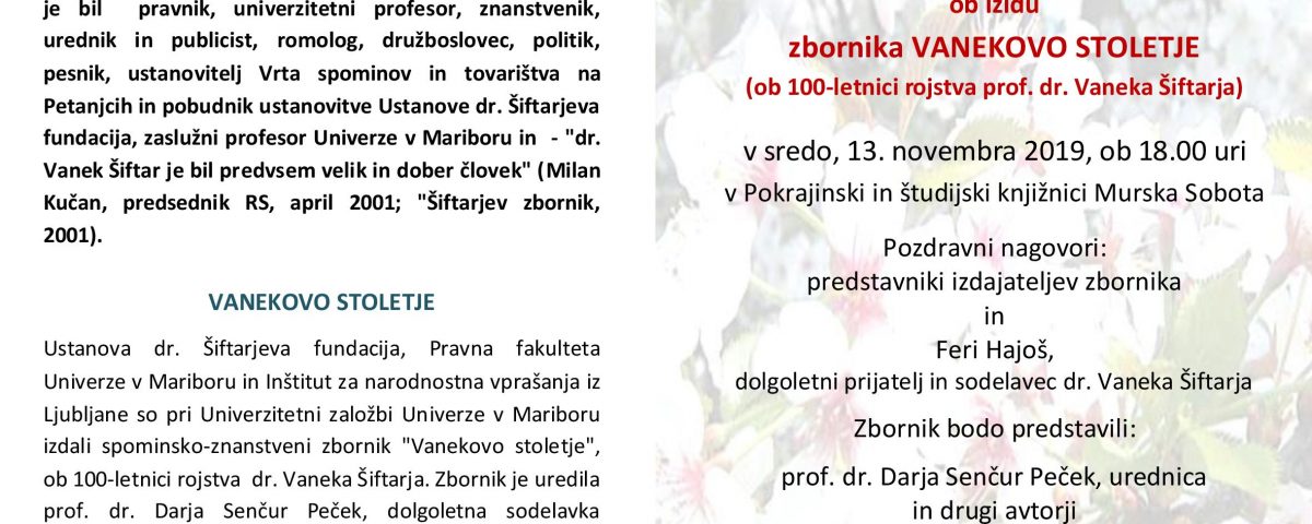 Vljudno vabljeni na spominsko slovesnost ob izidu spominsko-znanstvenega zbornika Vanekovo stoletje, ki bo v sredo, 13. novembra 2019 ob 18.00 uri, v Pokrajinski in študijski knjižnici Murska Sobota.