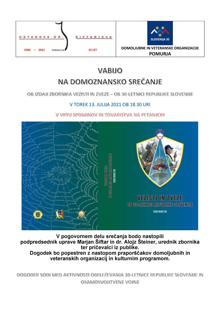 Ustanova dr. Šiftarjeva fundacija in domoljubne in veteranske organizacije Pomurja vas vabijo na domoznansko srečanje ob izdaji zbornika Vezisti in zveze – ob 30-letnici Republike Slovenije. Predstavitev zbornika bo v torek, 13. julija 2021. ob 18.30 v Vrtu spominov in tovarištva na Petanjcih.