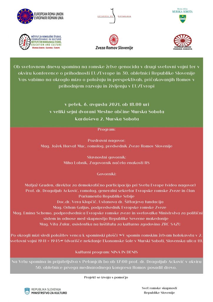 – po okrogli mizi sledi položitev venca k spominski plošči “v spomin romskim žrtvam holokavsta v drugi svetovni vojni 1941 – 1945” – dvorišče nekdanje Ekonomske šole v Murski Soboti, Slovenska ulica 11.
