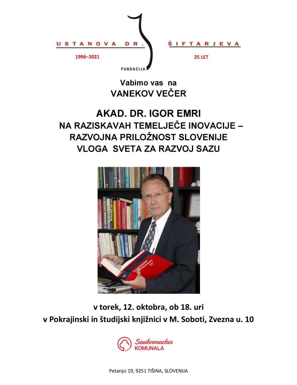 Vabimo vas na Vanekov večer z na temo “Na raziskavah temelječe inovacije – razvojna priložnost Slovenije”. Gost bo akademik, prof. dr. Igor Emri, (Murski Sobota, 1952), ki sodi med najuglednejše slovenske znanstvenike v svetovnem okviru. Dogodek bo v torek, 12. oktobra, ob 18. uri v Pokrajinski in študijski knjižnici v M. Soboti.