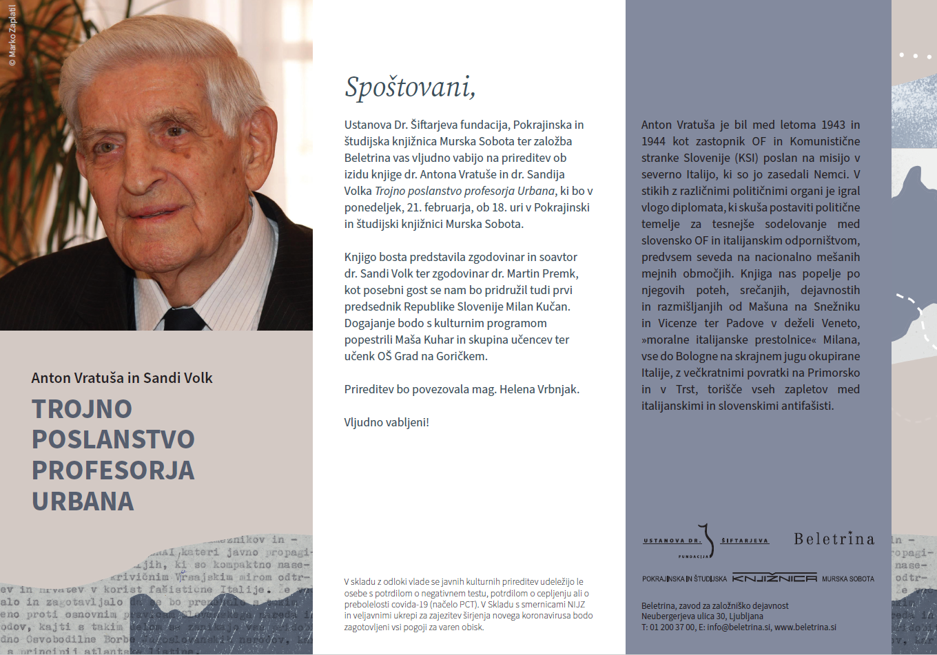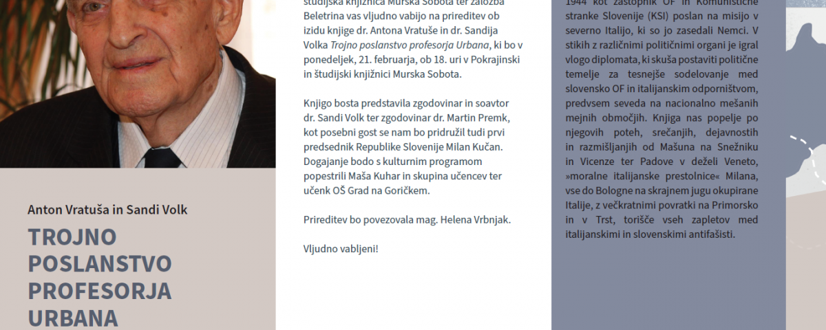 Ustanova Dr. Šiftarjeva fundacija, Pokrajinska in študijska knjižnica Murska Sobota ter založba Beletrina vas vljudno vabijo na prireditev ob izidu knjige dr. Antona Vratuše in dr. Sandija Volka Trojno poslanstvo profesorja Urbana, ki bo v ponedeljek, 21. februarja, ob 18. uri v Pokrajinski in študijski knjižnici Murska Sobota. Knjigo bosta predstavila zgodovinar in soavtor dr. Sandi Volk ter zgodovinar dr. Martin Premk, kot posebni gost se nam bo pridružil tudi prvi predsednik Republike Slovenije Milan Kučan. Dogajanje bodo s kulturnim programom popestrili Maša Kuhar in skupina učencev ter učenk OŠ Grad na Goričkem.